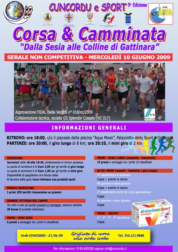 podistica2009_promos_250Si svolgerà mercoledì 10 giugno alle ore 20:00 l’appuntamento podistico della 9° Edizione di Cuncordu e Sport, che si snoda tra la riva destra della Sesia e la zona precollinare nei dintorni di Regione Crosa di Gattinara.