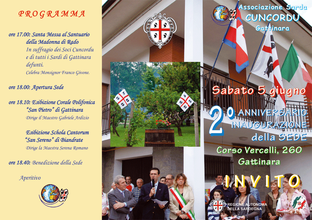 I festeggiamenti per l’anniversario del secondo anno della Nuova Sede vedrà la preziosa partecipazione di Don Franco Givone e delle Corali di Gattinara e di Biandrate che si esibiranno sia con brani del proprio repertorio, che con brani in sardo, studiati appositamente per l’occasione.